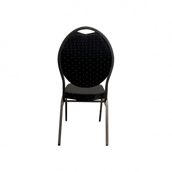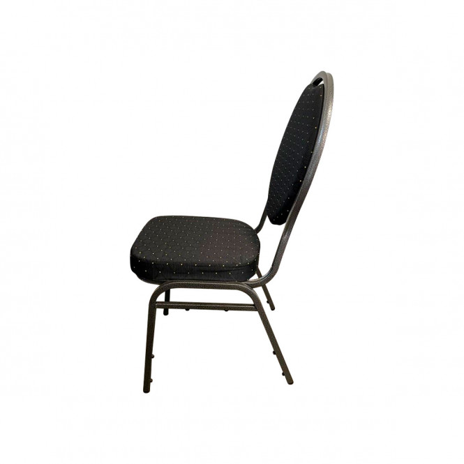 A Black fabric and Charcoal frame Spoon Back Banqueting chair, with a small gold fleck. One of our most popular banquet chairs for sale. This style of stacking chair is ideal for formal or corporate settings.